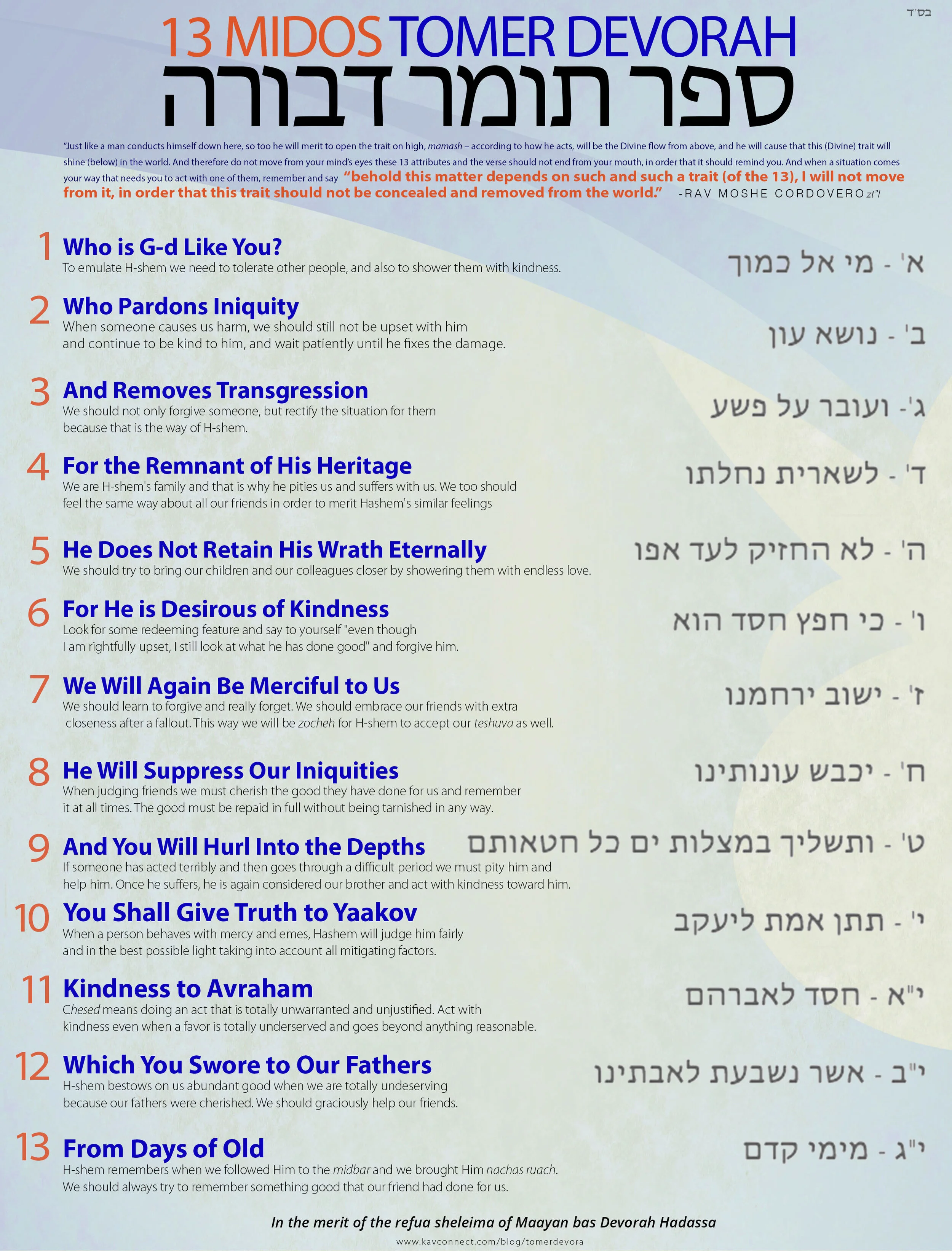 To now [we] have reached the 13 traits though which a person should resemble his Creator, which are the highest traits of mercy. And their special quality is that [just] as a person acts below, so [too] will he merit to open for himself the highest trait above - exactly as he acts, so will there be a flow from above. And he will cause that trait to shine in the world. And so he should not have these thirteen traits escape from the eyes of [his] mind. And he [should] not stop the verse from his mouth, so that it will be a reminder - when a situation comes to him that he needs to uses one of the traits, he will remember and say, "Behold, that thing depends upon trait x; I do not want to move from it, so that this trait does not disappear and retreat from the world."