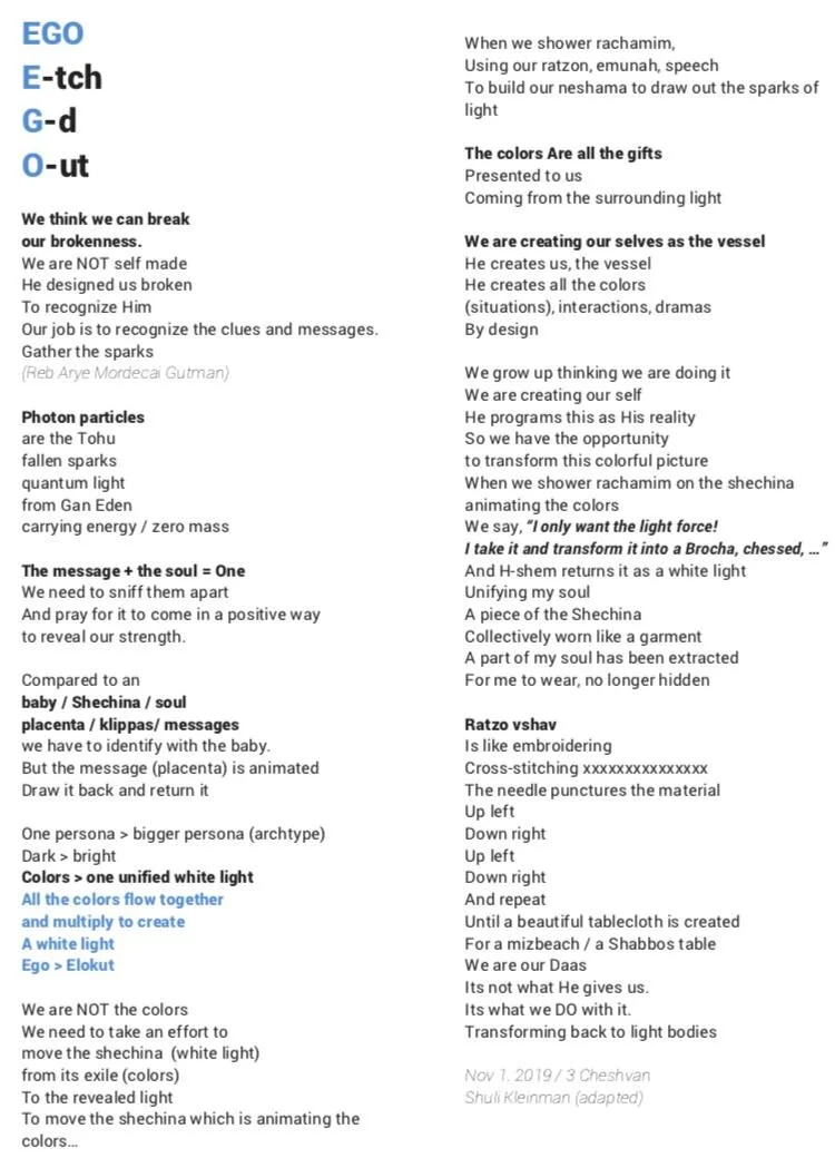 The Logo design is inspired by her words. This touched me very deeply as I have been through years of Art training, and specifically color theory. For a few decades I have been fascinated with the concept of the relationship of white/ black / colors. I write a poem when I was about 20 years old about WHITE being the combination of all colors. Here Shuli explains the pnimius. This is gadlus...