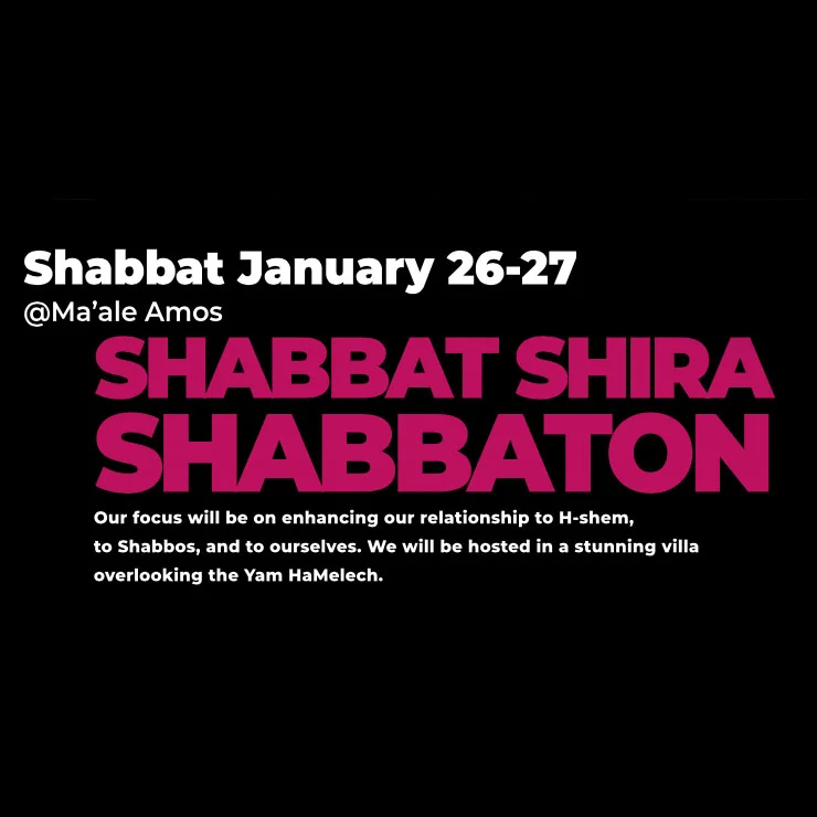 We then travel to beautiful Ma’aleh Amos (founded by Rav Noach Weinberg zt”l) where we are hosted in a gorgeous villa overlooking the Dead Sea for an inspirational Shabbos Shira of song & dance.