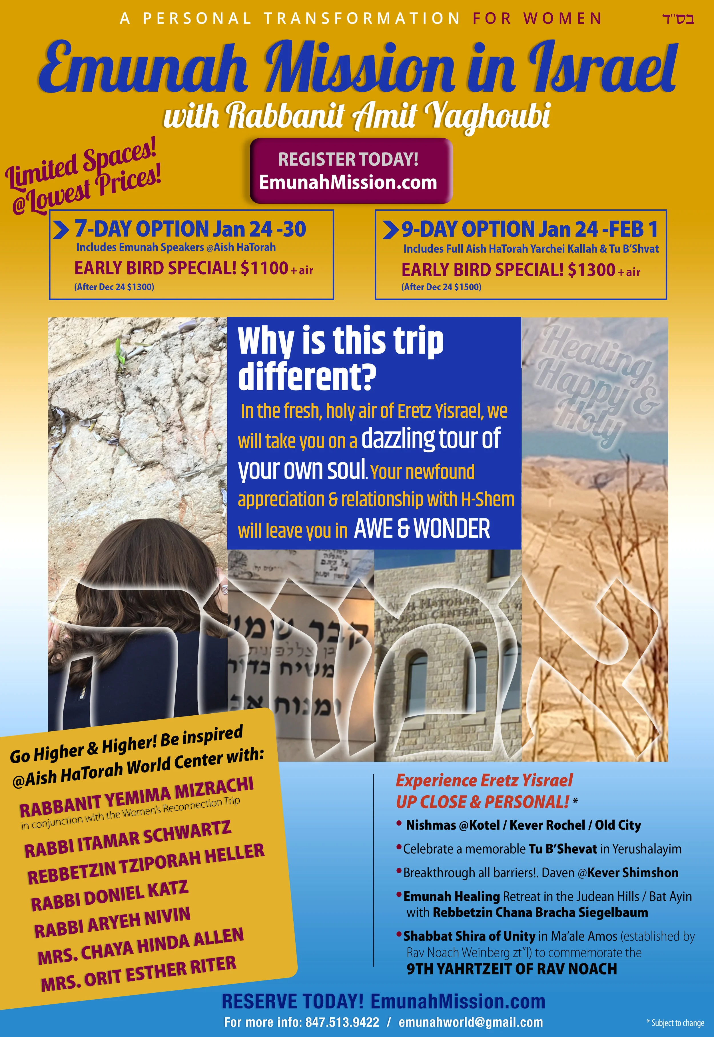 Emunah Missions connect women from around the world for incredibly inspiring programs imbibed with the kedusha and beauty of Israel. By experiencing real life with inspirational women teachers and mentors, these unique trips develop opportunities to strengthen and deeply enrich the lives of each participant.