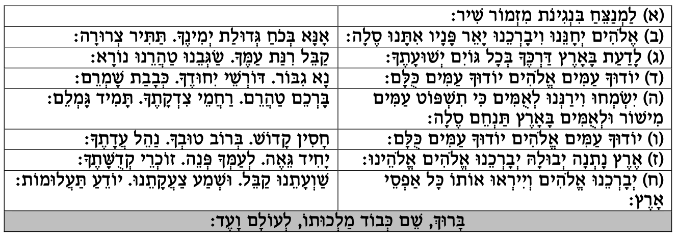 לַמְנַצֵּחַ בִּנְגִינוֹת מִזְמוֹר שִׁיר: אֱלֹהִים יְחָנֵּנוּ וִיבָרְכֵנוּ, יָאֵר פָּנָיו אִתָּנוּ, סֶלָה: לָדַעַת בָּאָרֶץ דַרְכֶּךָ, בְּכָל גּוֹיִם יְשׁוּעָתֶךָ: יוֹדוּךָ עַמִּים אֱלֹהִים, יוֹדוּךָ עַמִּים כֻּלָּם: יִשְׂמְחוּ וִירַנְּנוּ לְאֻמִּים, כִּי תִשְׁפֹּט עַמִּים מִישֹׁר, וּלְאֻמִּים בָּאָרֶץ תַּנְחֵם סֶלָה: יוֹדוּךָ עַמִּים אֱלֹהִים, יוֹדוּךָ עַמִּים כֻּלָּם: אֶרֶץ נָתְנָה יְבוּלָהּ, יְבָרְכֵנוּ אֱלֹהִים אֱלֹהֵינוּ: יְבָרְכֵנוּ אֱלֹהִים, וְיִירְאוּ אוֹתוֹ כָּל אַפְסֵי אָרֶץ: