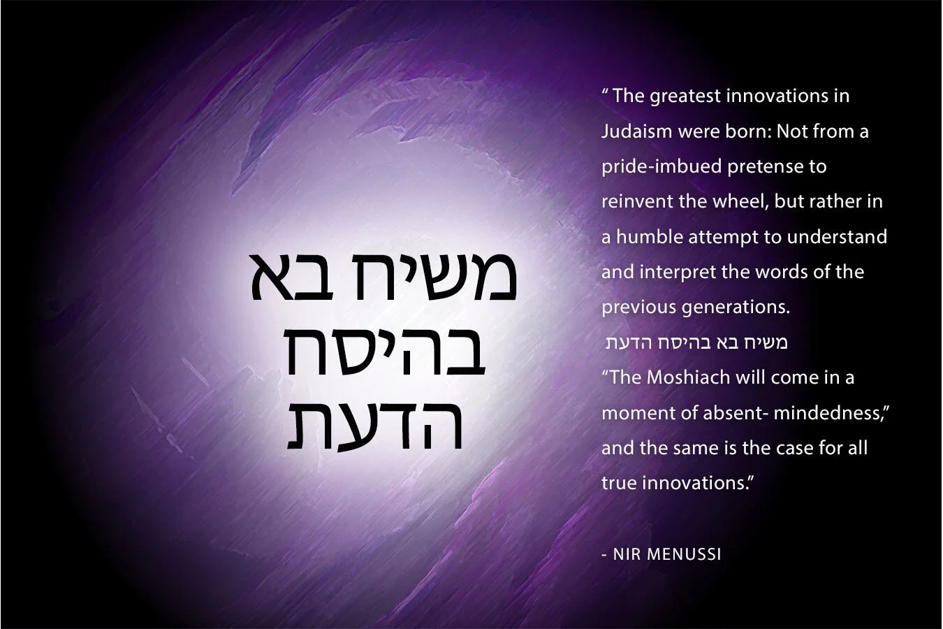 It is exactly in this way that the greatest innovations in Judaism were born: Not from a pride-imbued pretense to reinvent the wheel, but rather in a humble attempt to understand and interpret the words of the previous generations. "ืืฉืื ืื ืืืืกื ืืืขืช" โThe Messiah will come in a moment of absent-mindedness,โ and the same is the case for all true innovations.