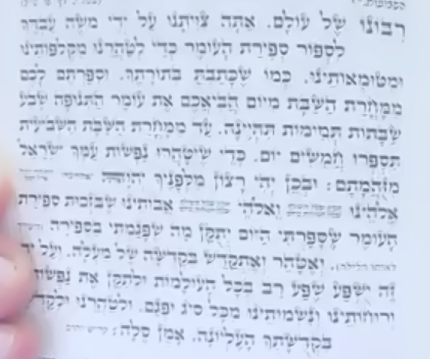 רִבּוֹנוֹ שֶׁל עוֹלָם, אַתָּה צִוִּיתָנוּ עַל יְדֵי מֹשֶׁה עַבְדֶּךָ לִסְפּוֹר סְפִירַת הָעוֹמֶר כְּדֵי לְטַהֲרֵנוּ מִקְּלִפּוֹתֵינוּ וּמִטֻּמְאוֹתֵינוּ, כְּמוֹ שֶׁכָּתַבְתָּ בְּתוֹרָתֶךָ: וּסְפַרְתֶּם לָכֶם מִמָּחֳרַת הַשַּׁבָּת מִיּוֹם הֲבִיאֲכֶם אֶת־עֹמֶר הַתְּנוּפָה שֶׁבַע שַׁבָּתוֹת תְּמִימֹת תִּהְיֶינָה. עַד מִמָּחֳרַת הַשַּׁבָּת הַשְּׁבִיעִת תִּסְפְּרוּ חֲמִשִּׁים יוֹם, כְּדֵי שֶׁיּטָּהֲרוּ נַפְשׁוֹת עַמְּךָ יִשְׂרָאֵל מִזֻּהֲמָתָם, וְּבְכֵן יְהִי רָצוֹן מִלְּפָנֶיךָ יְיָ אֱלֹהֵינוּ וֵאלֹהֵי אֲבוֹתֵינוּ, שֶׁבִּזְכוּת סְפִירַת הָעוֹמֶר שֶׁסָּפַרְתִּי הַיּוֹם, יְתֻקַּן מַה שֶׁפָּגַמְתִּי בִּסְפִירָה *___ שב___* וְאֶטָּהֵר וְאֶתְקַדֵּשׁ בִּקְדֻשָּׁה שֶׁל מַעְלָה, וְעל יְדֵי זֶה יֻשְׁפַּע שֶׁפַע רַב בְּכָל הָעוֹלָמוֹת וּלְתַקֵּן אֶת נַפְשׁוֹתֵינוּ וְרוּחוֹתֵינוּ וְנִשְׁמוֹתֵינוּ מִכָּל סִיג וּפְגַם וּלְטַהֲרֵנוּ וּלְקַדְּשֵׁנוּ בִּקְדֻשָּׁתְךָ הָעֶלְיוֹנָה, אָמֵן סֶלָה: